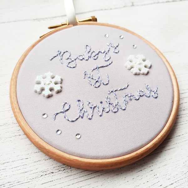 Set in a 4" hoop,  your ornament will come complete with hand stitched sparkly embellishments and coordinating ribbon to hang your decoration on a Christmas tree.