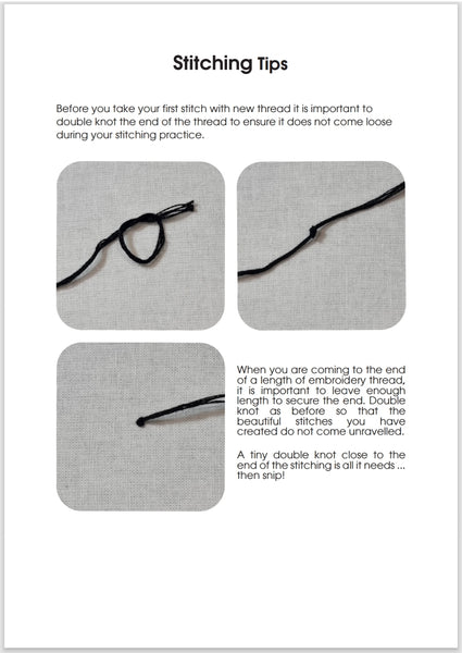 This 16 page booklet contains stitch tips and 10 stitches which include: Back stitch, Whipped Back Stitch, Detached Chain Stitch, French Knots, Chain Stitch, Straight Stitch, Couching, Seed Stitch, Split Stitch and Cross Stitch.